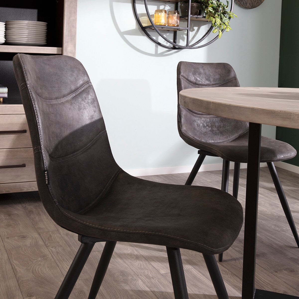 Eetkamerstoel Cala is een moderne stoel met een stoer design. De stof doet denken aan leer, maar is gemaakt van het onderhoudsvriendelijke microvezelstof. De dubbele sierstiksels en de slanke stoelpoten geven het geheel een industriële look. Nu nog de kleur kiezen en dat wordt moeilijk, want deze eetkamerstoel is verkrijgbaar is antraciet, cognac en olive. Je kunt het jezelf ook gemakkelijk maken door een combinatie van deze stoelen aan te schaffen. Zo creëer je een speelse en stijlvolle look! Deze stoel zit bovendien lekker comfortabel, omdat de zitting en de rug gevuld zijn met een comfortabel schuim.