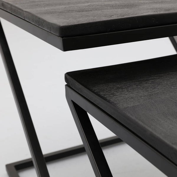 Wil jij een originele salontafel kopen? Salontafelset Zaza is een bestseller in onze webshop en wij snappen wel waarom. Beide zwarte salontafels hebben een metalen frame in een verrassende Z-vorm en een robuust tafelblad van mangohout. Het fijne van deze salontafels is dat je ze zo onder elkaar schuift als je ruimte wil besparen in je woonkamer. Toch liever iets meer plek op tafel nodig? Dan haal je ze weer onder elkaar vandaan. Salontafel, bijzettafel, koffietafel of hoektafel: dankzij het formaat van 40x40x40 cm en 50x50x50 cm (bxhxd) kun je de Zaza-salontafels echt voor alles gebruiken!