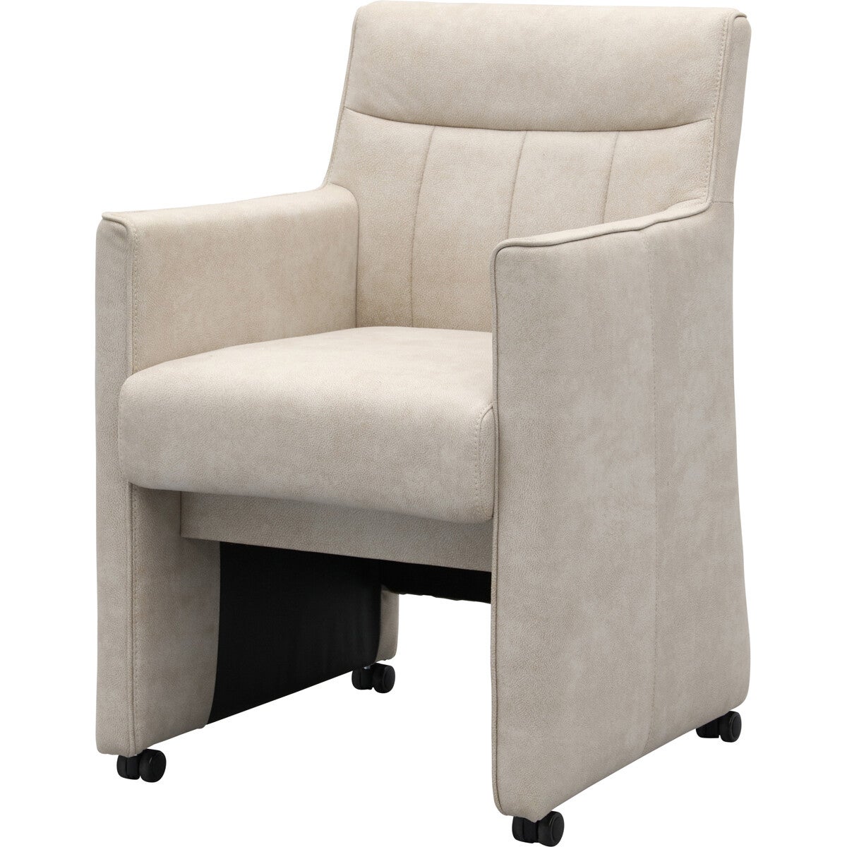 Op eetkamerstoel Wesley wordt dineren een feestje! Met een zithoogte van 50,5 cm, een zitdiepte van 46 cm en de armleuningen, biedt Wesley comfortabele elegantie. De bekleding, microleder Luxor, en de zwarte metalen poot geven de stoel een stoere touch. Kies uit de trendy kleuren antracite, sand en thyme om perfect bij jouw interieur aan te laten sluiten. Wesley is niet alleen mooi, maar ook super praktisch door de zwarte wieltjes en het handvat op de rug. Transformeer jouw eetruimte met eetkamerstoel Wesley.