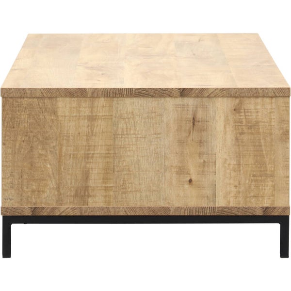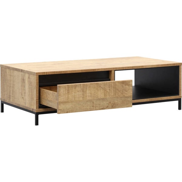 Salontafel Braga heeft een subtiele, stoere uitstraling en is voorzien van 1 lade en 1 open vak. De Braga salontafels worden gemaakt van melamine in de houtkleur mango en zwarte details in de binnenranden en poten. Door dit sterke materiaal oogt salontafel Braga als een massief houten tafel. Melamine is echter veel krasbestendiger en makkelijker schoon te maken met een vochtige doek, dus onderhoudsvrij! Dit alles geeft salontafel Braga een eigen stijl en past perfect in een industrieel interieur.