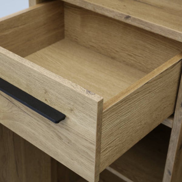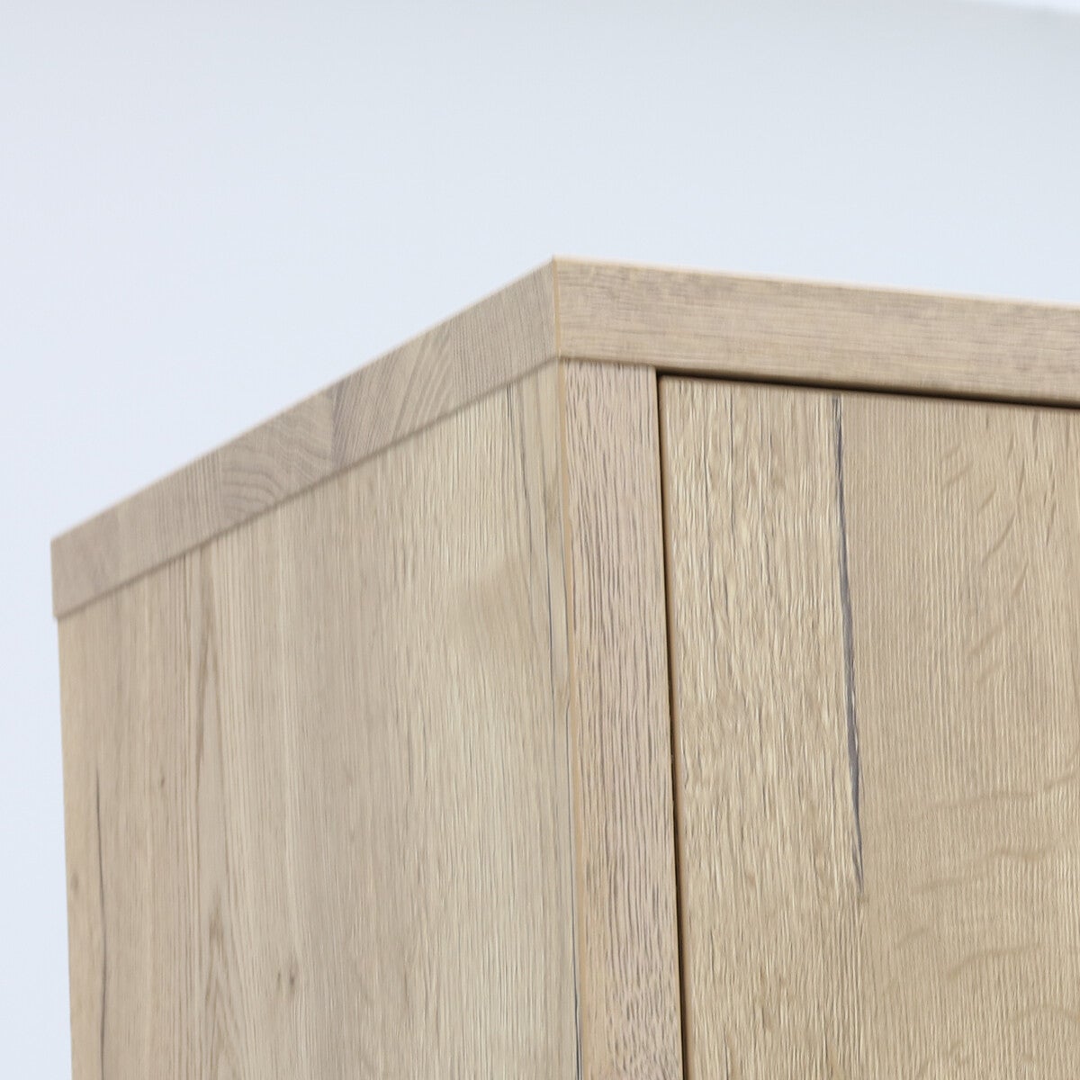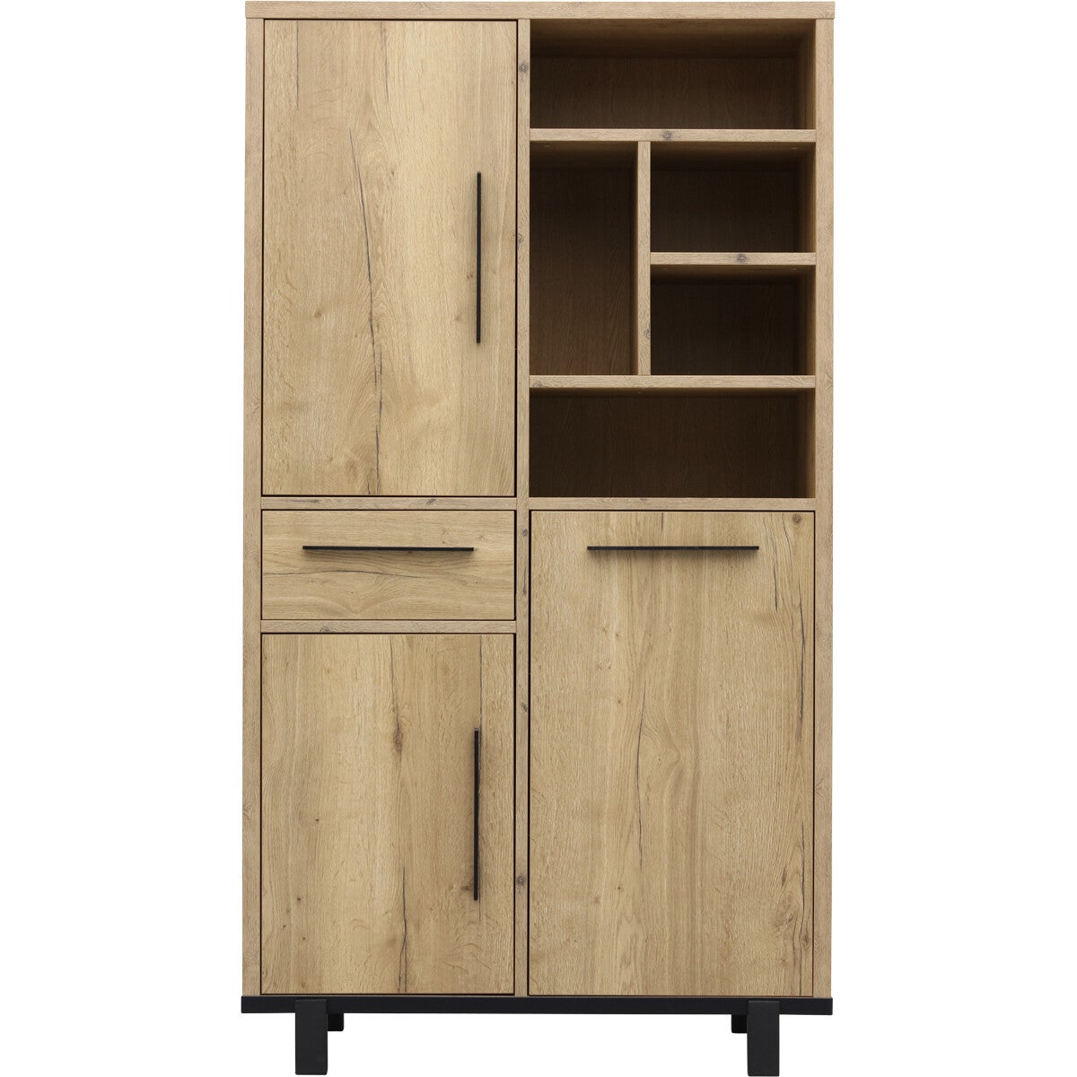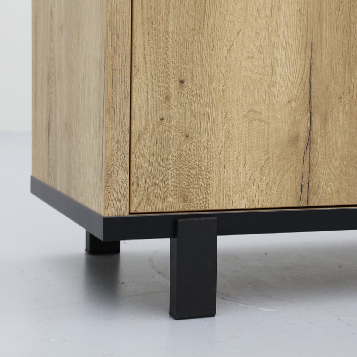 Barkast Wilson: ruime, moderne kast voorzien van een luxe softclosesysteem. Barkast Wilson heeft 1 lade, 5 open vakken en achter 3 deuren nog eens 8 vakken met vaste planken. Het design is strak en eigentijds. De kast heeft een zwart stalen frame (kastpootjes 11,5 cm hoog) en handgrepen en is afgewerkt met melamine in lichte houtlook. Melamine is een sterke kunststoflaag die oogt en voelt als massief hout. Een melamine kast biedt jou een aantal voordelen. Barkast Wilson is hierdoor behoorlijk krasvast, werkt niet en makkelijk schoon te maken met een vochtige doek. Het prettige van softclose is dat lades en deuren van barkast Wilson altijd rustig sluiten.