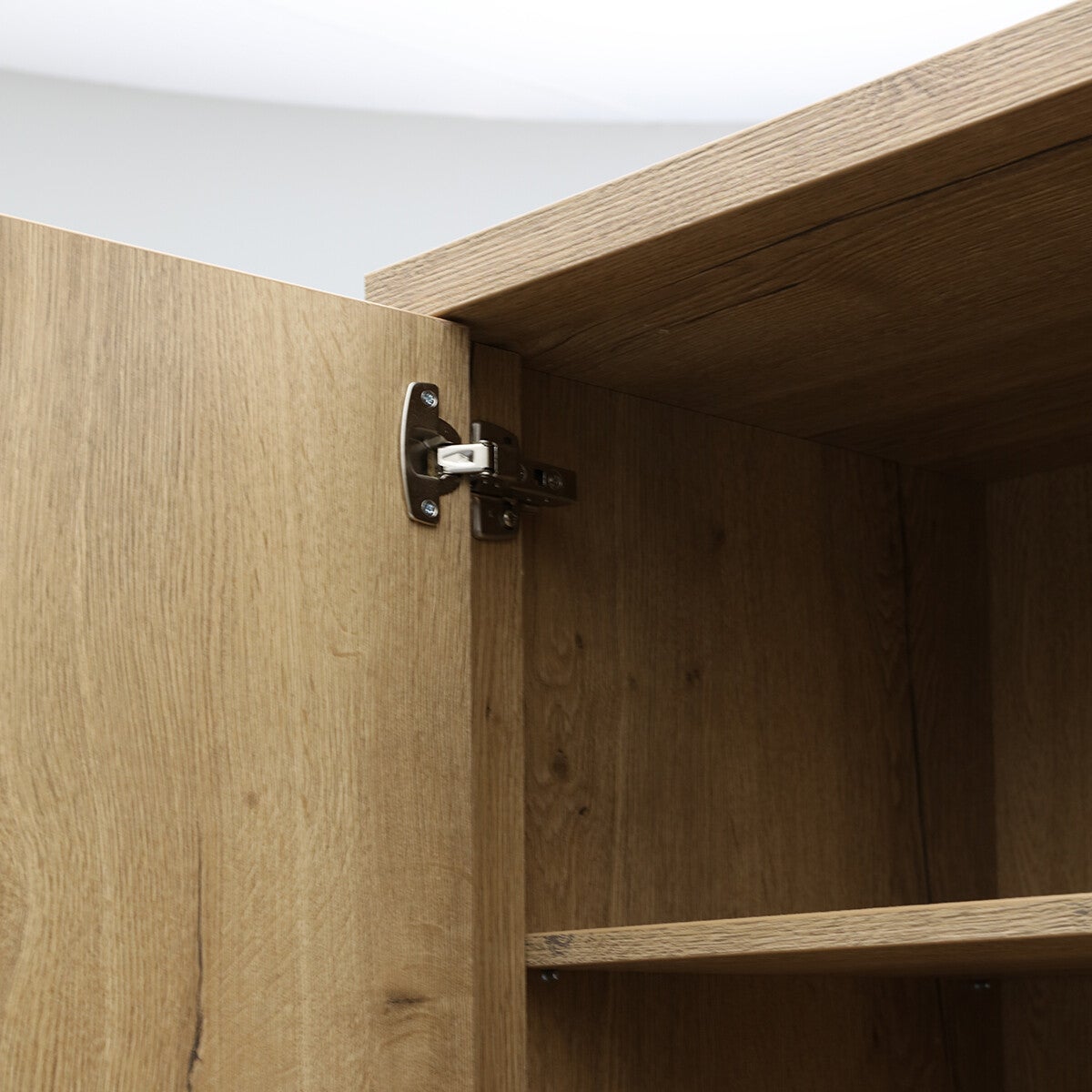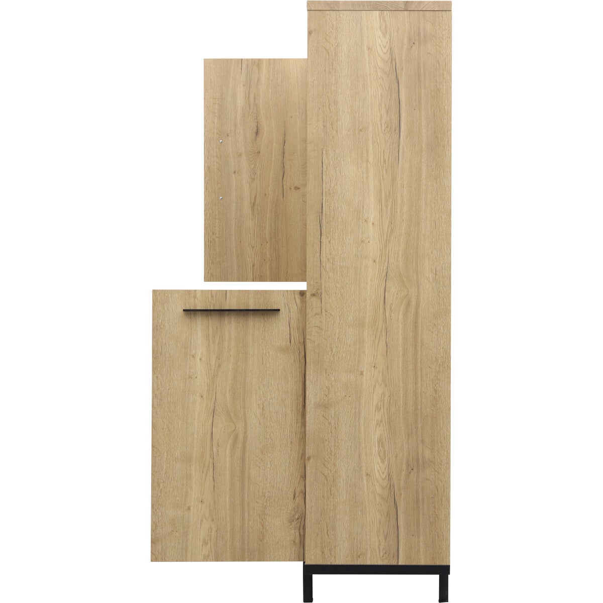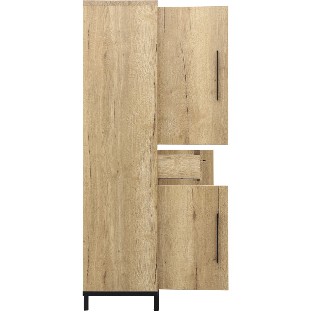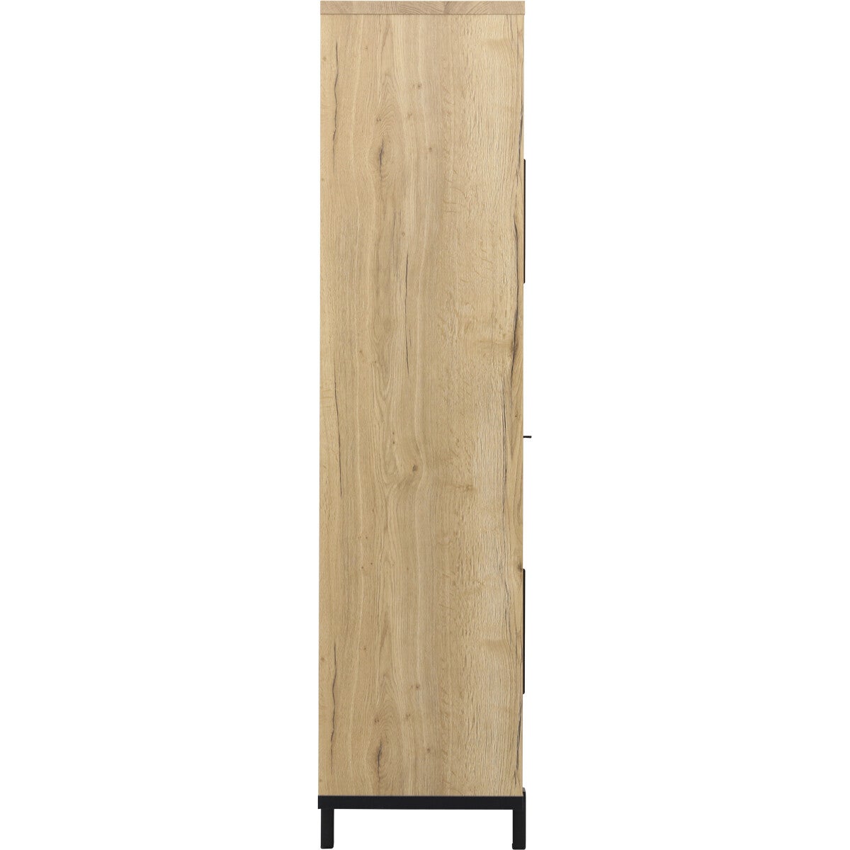 Barkast Wilson: ruime, moderne kast voorzien van een luxe softclosesysteem. Barkast Wilson heeft 1 lade, 5 open vakken en achter 3 deuren nog eens 8 vakken met vaste planken. Het design is strak en eigentijds. De kast heeft een zwart stalen frame (kastpootjes 11,5 cm hoog) en handgrepen en is afgewerkt met melamine in lichte houtlook. Melamine is een sterke kunststoflaag die oogt en voelt als massief hout. Een melamine kast biedt jou een aantal voordelen. Barkast Wilson is hierdoor behoorlijk krasvast, werkt niet en makkelijk schoon te maken met een vochtige doek. Het prettige van softclose is dat lades en deuren van barkast Wilson altijd rustig sluiten.