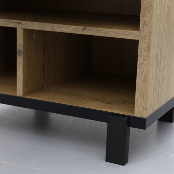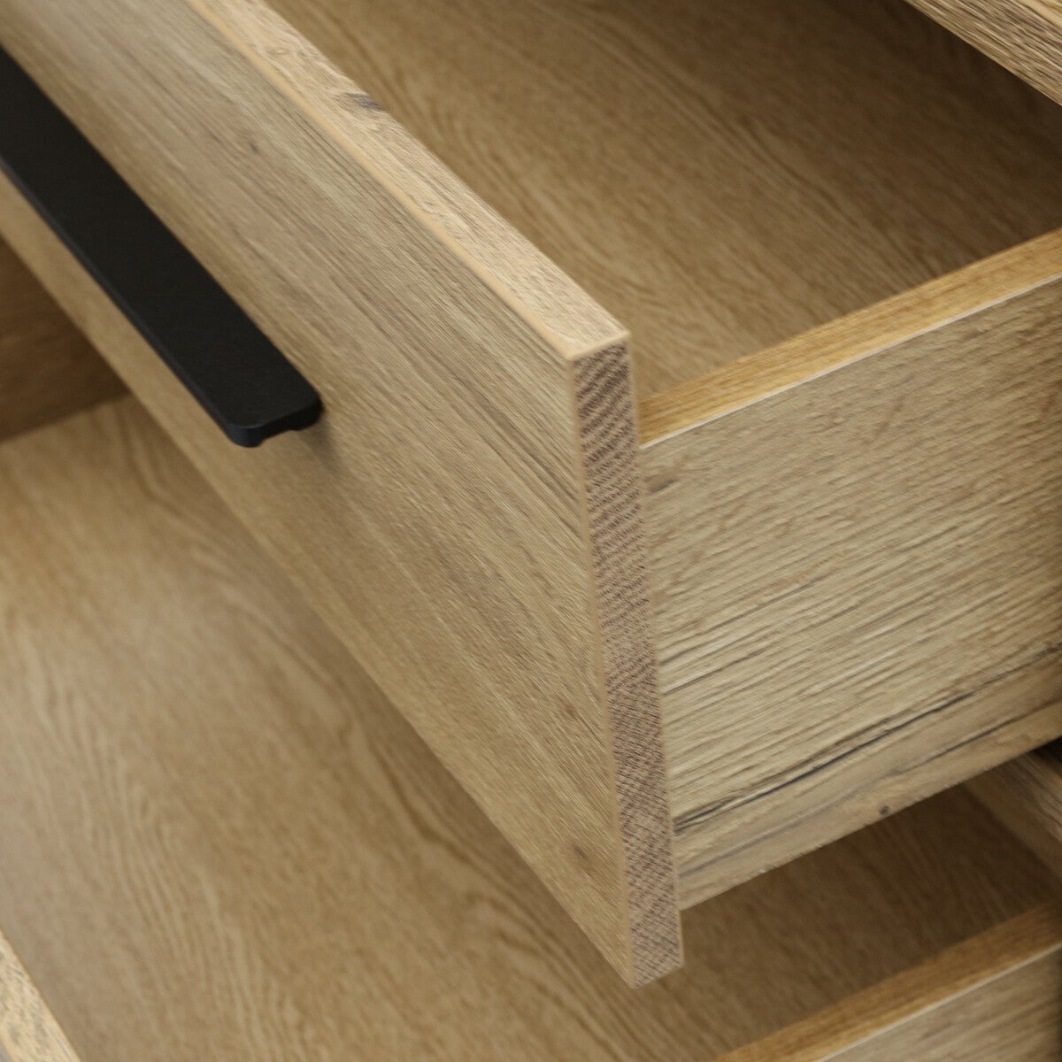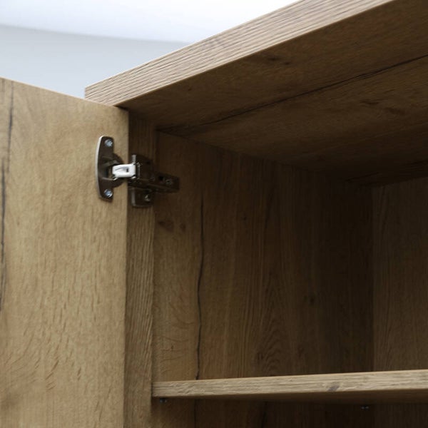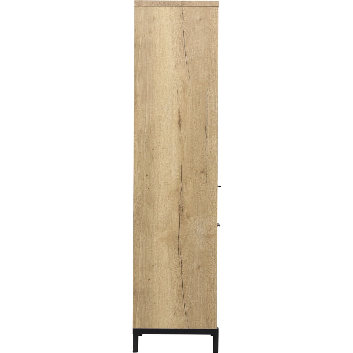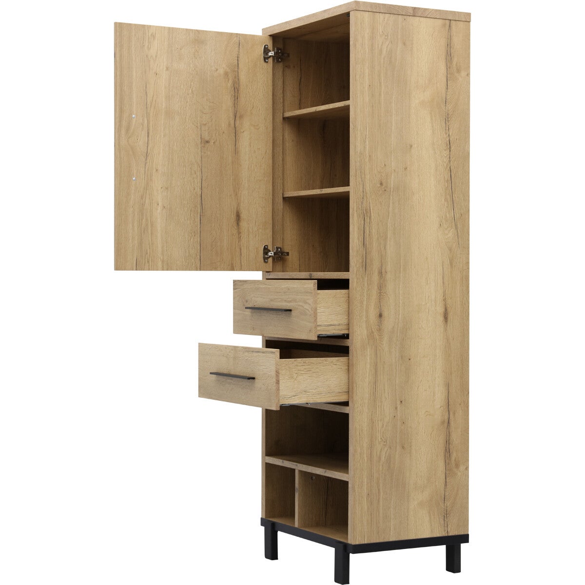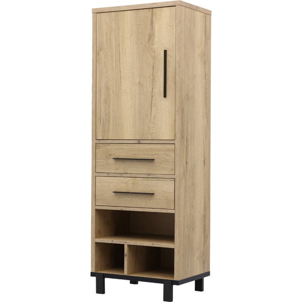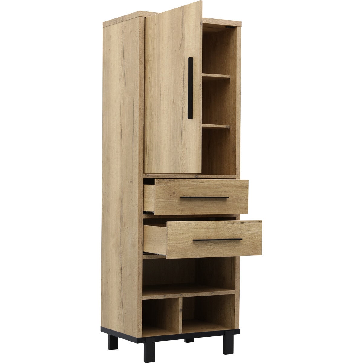 Broodkast Wilson: moderne smalle kast bij Budget Home Store voorzien van een luxe softclosesysteem. Broodkast Wilson heeft 2 lades, onderin 3 open vakken en achter 1 deur nog 3 vakken met vaste planken. Het design is strak en eigentijds. De kast heeft een zwart stalen frame (kastpootjes 11,5 cm hoog) en handgrepen en is afgewerkt met melamine in lichte houtlook. Melamine is een sterke kunststoflaag die oogt en voelt als massief hout. Een melamine kast biedt jou een aantal voordelen. Broodkast Wilson is hierdoor behoorlijk krasvast, werkt niet en is makkelijk schoon te maken met een vochtige doek. Het prettige van softclose is dat lades en deuren van broodkast Wilson altijd rustig sluiten. Deze broodkast van Budget Home Store is een multifunctionele wandkast. Je kunt Wilson gebruiken als opbergkast, buffetkast, boekenkast of voorraadkast.