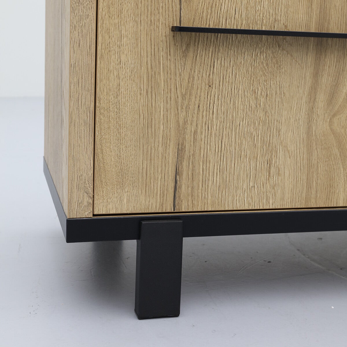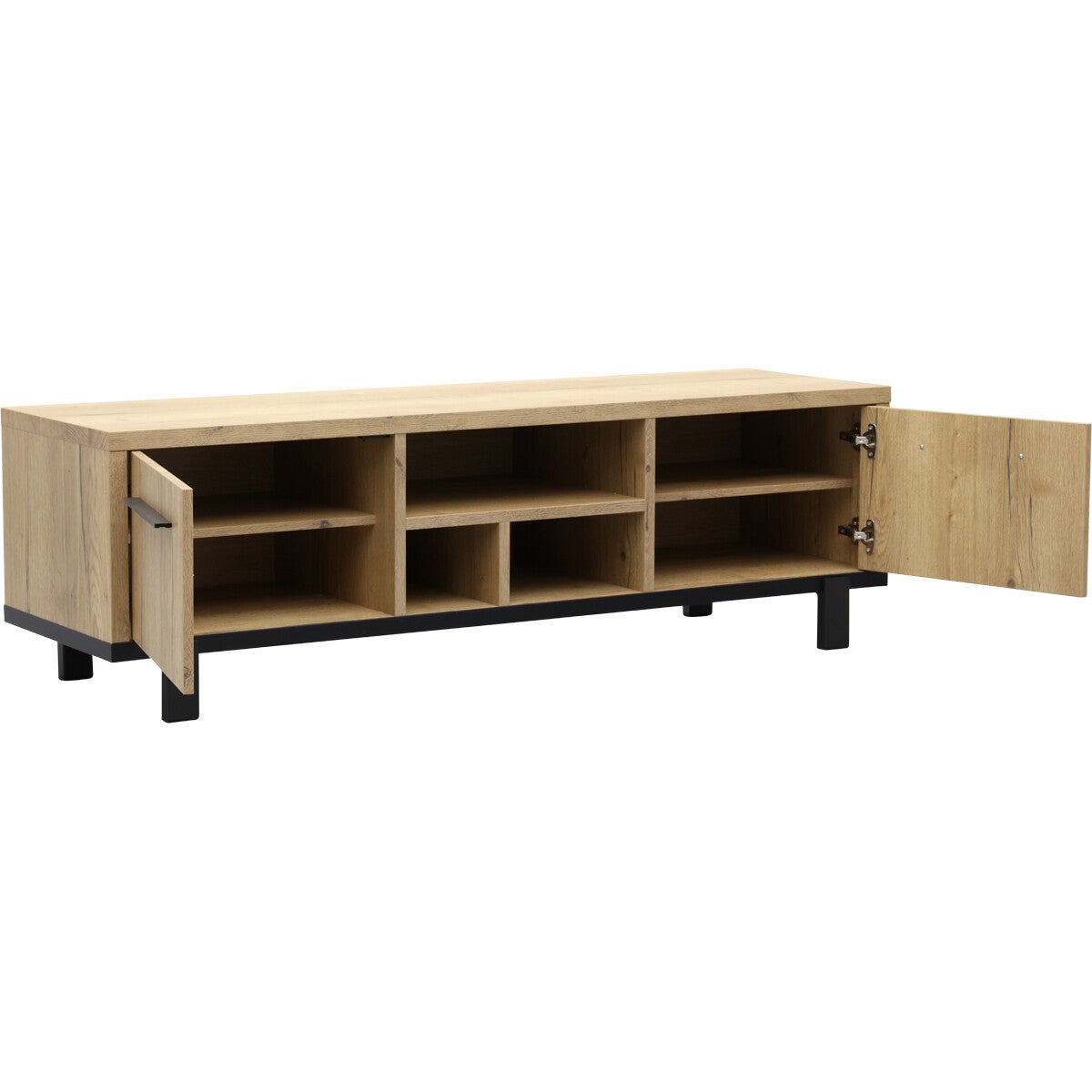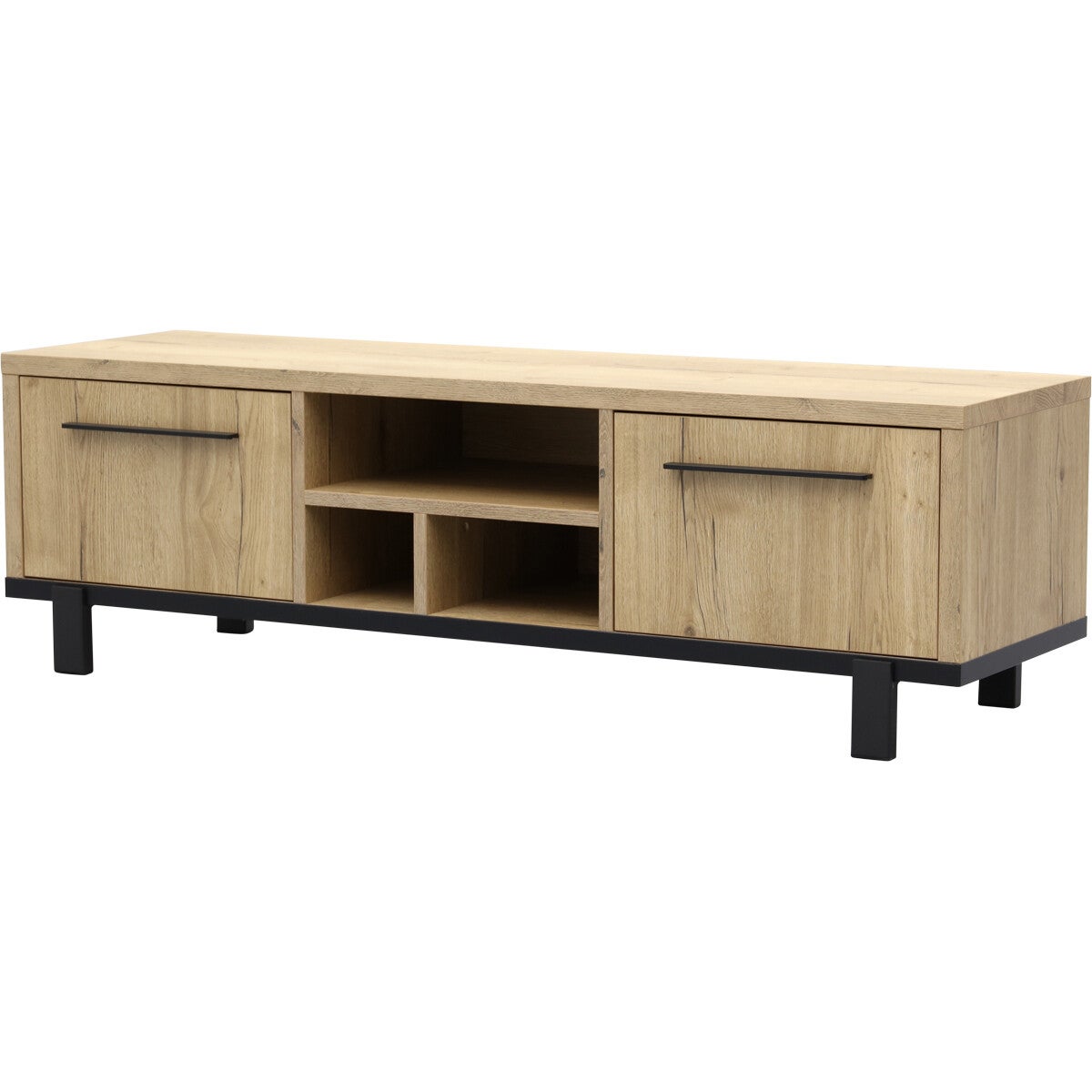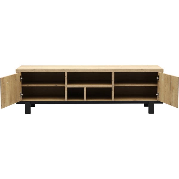 Tv-meubel Wilson is een moderne tv-kast van 165 cm breed en is voorzien van een luxe softclosesysteem. Tv-meubel Wilson heeft 3 open vakken en 4 vakken met vaste planken achter 2 deuren. Daardoor is deze multifunctionele lage wandkast van Budget Home Store ook een ideale opbergkast. Het design van de lage televisiekast (50 cm) is strak en eigentijds. Tv-meubel Wilson heeft een zwart stalen frame (kastpootjes 11,5 cm hoog) en handgrepen en is afgewerkt met melamine in lichte houtlook. Melamine is een sterke kunststoflaag die eruit ziet en voelt als massief hout. Een melamine kast biedt jou een aantal voordelen. De tv-kast van Budget Home Store oogt hierdoor als tv-meubel van hout, is behoorlijk krasvast, werkt niet en makkelijk schoon te maken met een vochtige doek. Het prettige van de softclose op de deuren is dat die altijd rustig sluiten.