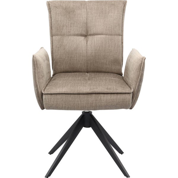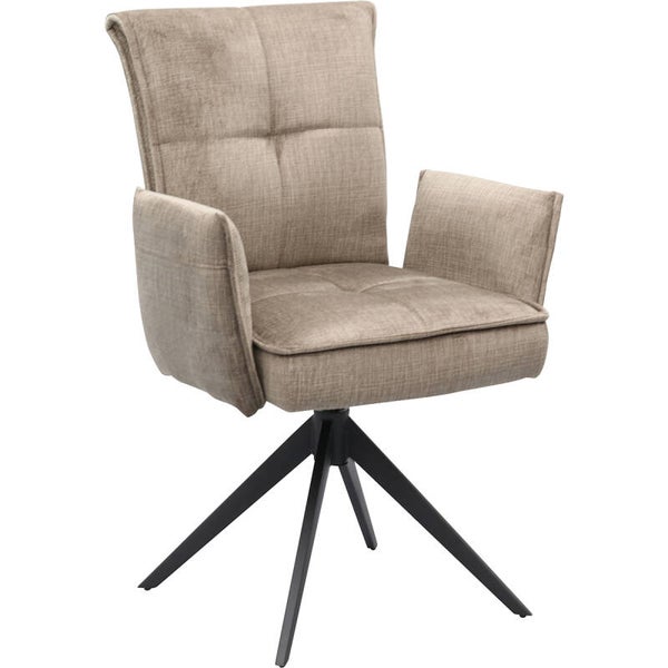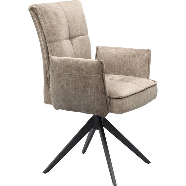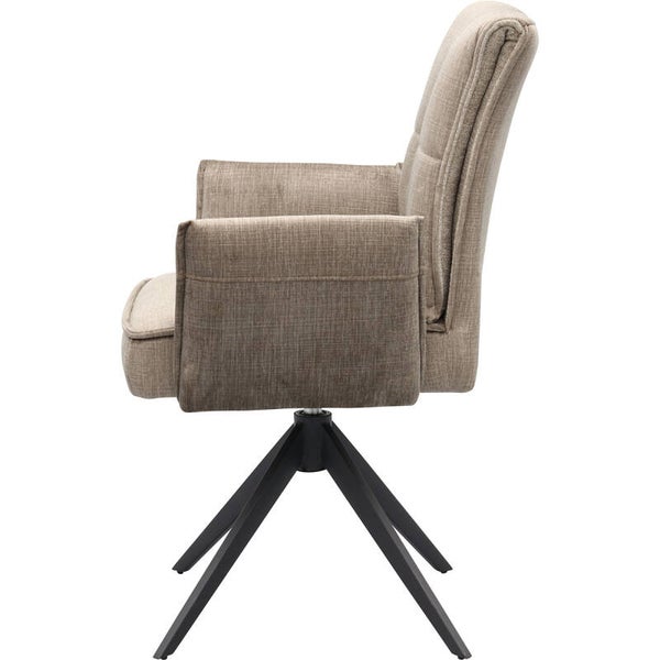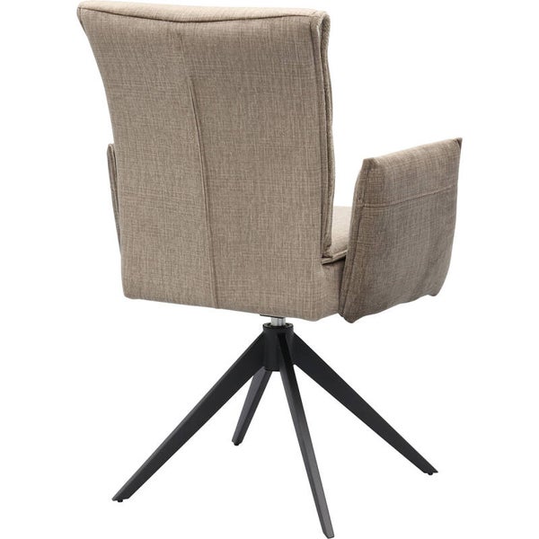 Maak kennis met eetkamerstoel Mare, een eigentijdse toevoeging aan jouw interieur. Met een afmeting van 45x92x46 cm en de armleuningen biedt Mare niet alleen comfort, maar ook sfeer. De stoel is bekleed met een fijne grijze stof en heeft opvallende stiksels in zowel de zitting als de rugleuning. De zwarte metalen spinpoot is draaibaar en voorzien van een handig terugdraai mechanisme, wat zorgt voor extra flexibiliteit aan tafel. Mare is de perfecte combinatie van opvallend design en praktische functionaliteit.