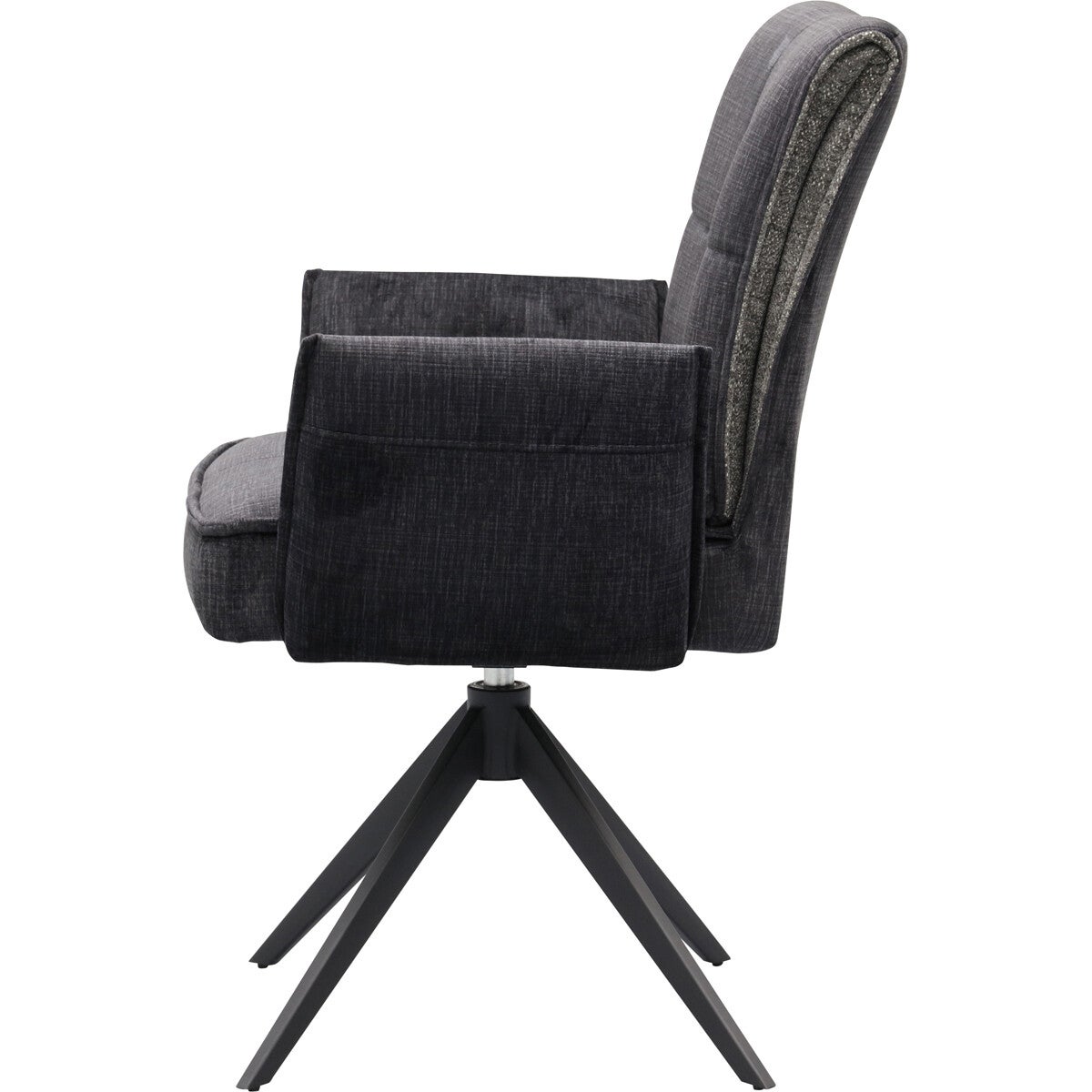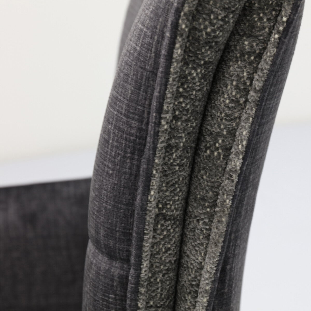 Maak kennis met eetkamerstoel Mare, een eigentijdse toevoeging aan jouw interieur. Met een afmeting van 45x92x46 cm en de armleuningen biedt Mare niet alleen comfort, maar ook sfeer. De stoel is bekleed met een fijne grijze stof en heeft opvallende stiksels in zowel de zitting als de rugleuning. De zwarte metalen spinpoot is draaibaar en voorzien van een handig terugdraai mechanisme, wat zorgt voor extra flexibiliteit aan tafel. Mare is de perfecte combinatie van opvallend design en praktische functionaliteit.