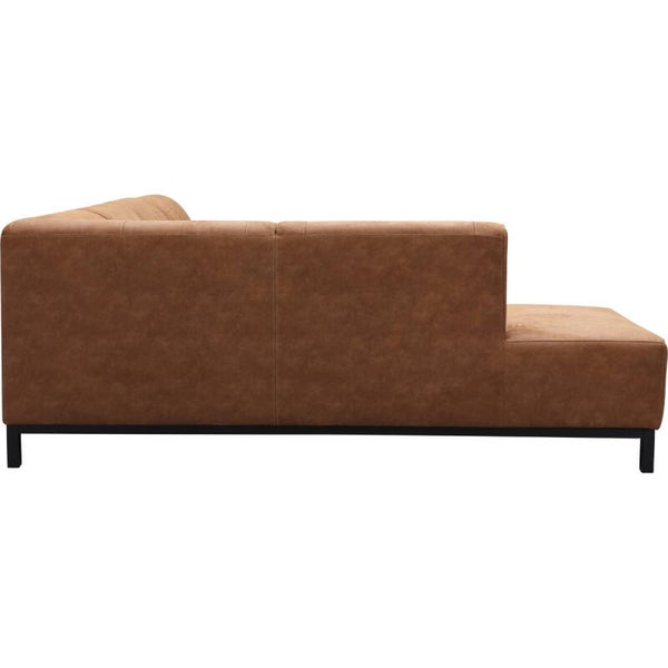 - Uitvoering getoond model Hoek-zit-eiland links + 2,5 zits + longchair rechts in Bull Brandy met zwart houten plintpoot