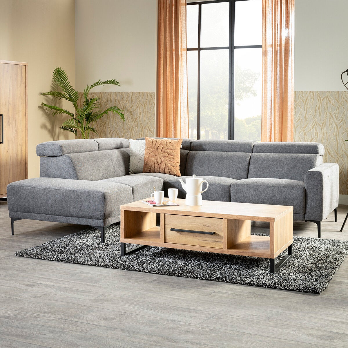 - Uitvoering getoond model hoekziteiland + 1 zits + 1 zits met relaxfunctie in stof brego antraciet