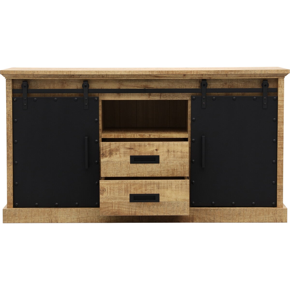 Dressoir Ibiza is een lage kast met barndoor schuifdeuren en heeft een industriële uitstraling. Het dressoir is versierd met stoere metalen details zoals de handgrepen en de schuifdeuren die hangen aan een barndoorsysteem. Kast Ibiza is sfeervol door de mangohouten kleur van melamine: een sterke kunststoflaag die oogt en voelt als massief hout. De voordelen van melamine zijn dat deze laag in hoge mate krasvast is, makkelijk schoon te maken is en niet zal gaan werken. Dressoir Ibiza heeft zowel planken als lades en een open vak. Met 2 dichte schuifdeuren van zwart metaal sluit je de rest af. Dus, genoeg plek voor het showen van mooie woondeco en om spullen in op te bergen. Dit dressoir heeft de volgende afmeting: breedte 160 cm x hoogte 85 cm x diepte 50 cm.