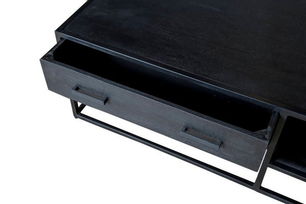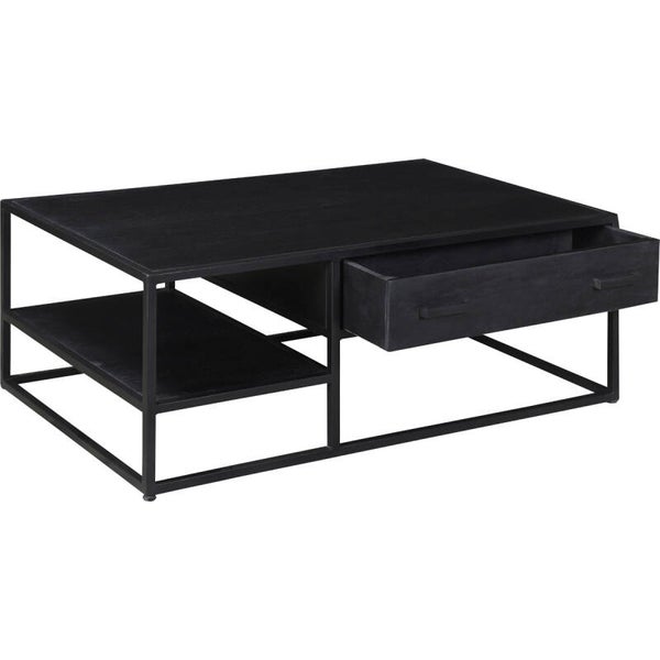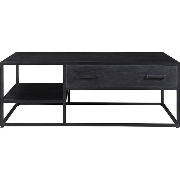 Hallo stoere salontafel! Met tafel Kolo haal je zowel een trendy als een praktische salontafel in huis. Gemaakt van warm mangohout in een zwarte tint en afgewerkt met een zwarte, metalen omlijsting en grepen van ditzelfde materiaal. Salontafel Kolo is 120 cm breed, 40 cm hoog en 70 cm diep en is voorzien van 1 lade en een plank.