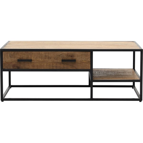 Salontafel Solo 120 cm breed bij Budget Home Store. Deze salontafel met opbergruimte heeft een sfeervol industrieel design, is rechthoekig en super handig. Dankzij een open vak en lades kun je in deze industriële salontafel van mangohout en metaal spullen opruimen. Zo heb je tijdens een avond op de bank naast je drinken ook de afstandsbediening of je favoriete magazines binnen handbereik. Het design van salontafel Solo past in een modern en industrieel interieur. De tafel van Budget Home Store is een stoere en stijlvolle toevoeging aan je zithoek. De salontafel is gemaakt van mangohout en staat zeer stabiel op een frame van zwart gecoat metaal. De maten van salontafel Solo zijn: 120 x 40 x 70 cm (b x h x d)