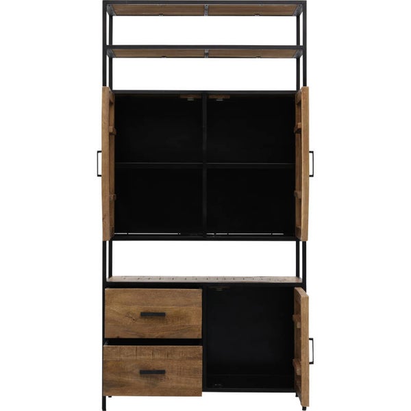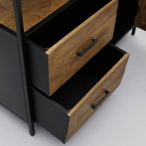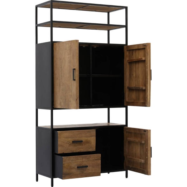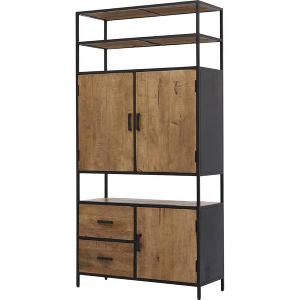 Opbergkast Solo is een industriële kast met open vakken uit de trendy en tijdloze collectie van Budget Home Store. Gemaakt van warm mangohout en afgewerkt met een zwarte metalen omlijsting en grepen en pootjes van hetzelfde materiaal. Deze kast is voorzien van in totaal 3 deuren, 2 lades en 3 open vakken. Genoeg ruimte voor het opbergen van veel spullen dus! De afmeting van deze opbergkast is 100x200x40 cm (bxhxd). Is deze je te klein of te groot? Dan is bergkast Solo er ook nog in andere formaten.