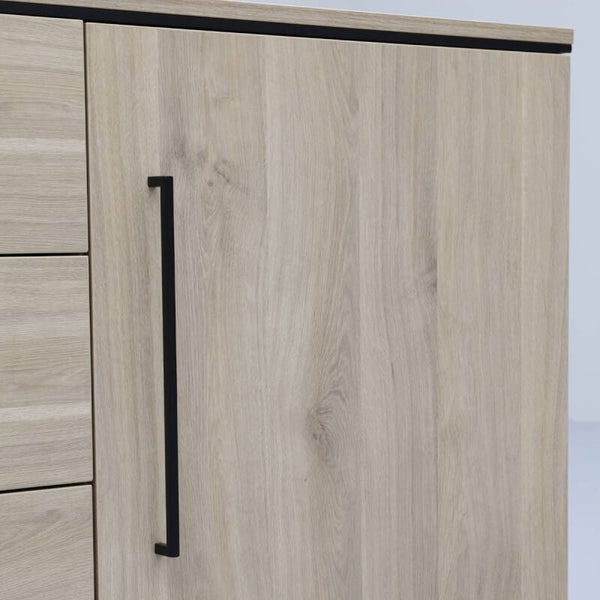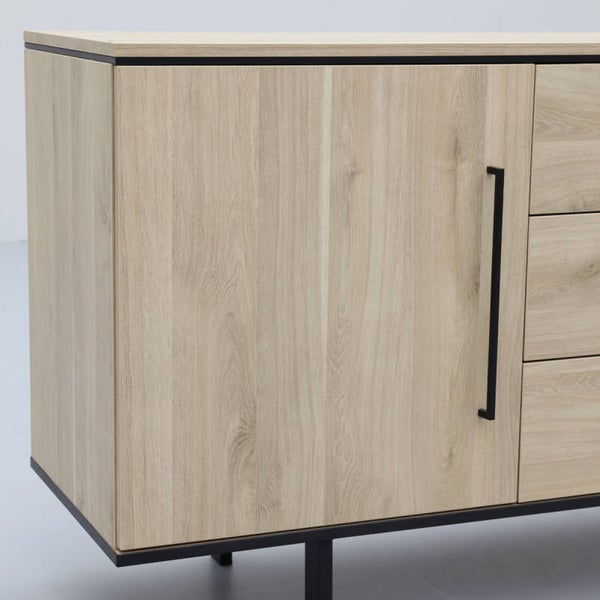 Zoek je een modern dressoir? Dan is dressoir Stilo iets voor jou! Met 2 deuren en 3 lades heeft dit dressoir een strakke, robuuste uitstraling die mooi aansluit in een modern industrieel interieur. Het dressoir heeft veel opbergmogelijkheden en bovenop het dressoir is genoeg plek voor mooie accessoires. De strakke, zwarte designpoot en handgrepen geven dressoir Stilo een stoere en sfeervolle uitstraling. De kast heeft een melamine afwerking in de kleur fresh oak. Melamine is een sterk materiaal dat oogt als massief hout. Het is in hoge mate krasbestendig en onderhoudsvriendelijk: je hoeft hem enkel schoon te maken met een vochtige doek. De afmeting van dit dressoir is 181x80x45 cm (bxhxd). Is deze je te klein? Dan is Stilo er ook nog in een grotere variant.