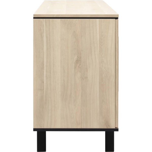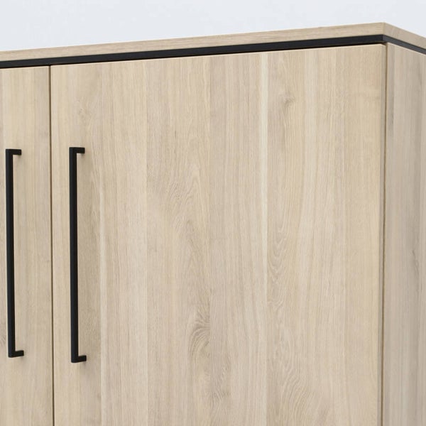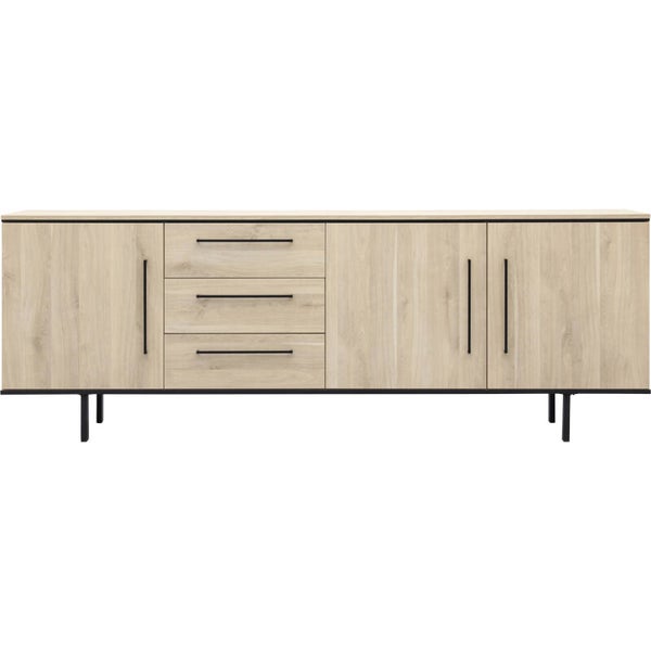 Op zoek naar een kast die je op verschillende manieren kan gebruiken? Dan is dressoir Stilo iets voor jou! Met 3 deuren en 3 lades heeft dit dressoir een strakke, robuuste uitstraling die mooi aansluit in een modern industrieel interieur. Het dressoir heeft veel opbergmogelijkheden en kan je op vele manieren gebruiken zoals servieskast, voorraadkast of opbergkast. De strakke, zwarte designpoot en handgrepen geven dressoir Stilo een stoere en sfeervolle uitstraling. De kast heeft een melamine afwerking in de kleur fresh oak. Melamine is een sterk materiaal dat oogt als massief hout. Het is in hoge mate krasbestendig en onderhoudsvriendelijk: je hoeft hem enkel schoon te maken met een vochtige doek. De afmeting van dit dressoir is 221x80x45 cm (bxhxd). Is deze je te groot? Dan is Stilo er ook nog in een kleinere variant.