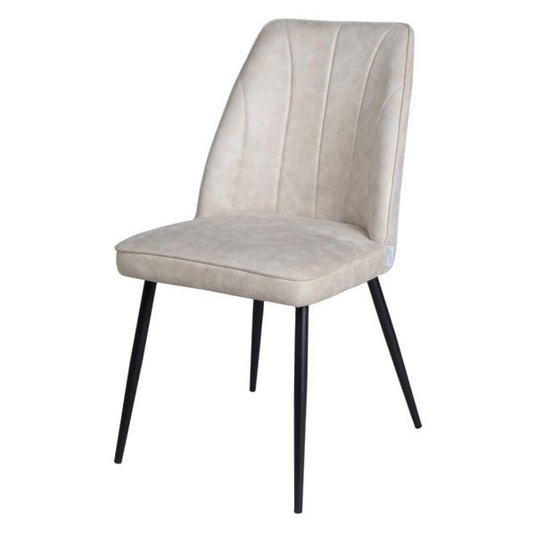 Prachtig Pien. Deze zandkleurige eetkamerstoel met verticale stiksels in de rug past door het tijdloze uiterlijk in iedere eetkamer. De kuip van de stoel staat op metalen zwarte pootjes voor een stoere touch en de afmeting van Pien is 49x88x58,50 cm.